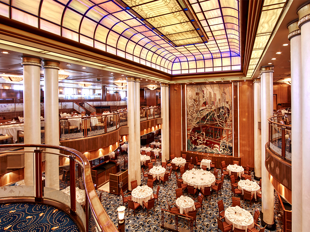 海側バルコニー、海側、内側キャビンなどをご利用のお客様用の主食堂。20世紀前半の豪華客船の主食堂を再現したような雰囲気です。朝・昼食は自由席で、夕食は2回制。