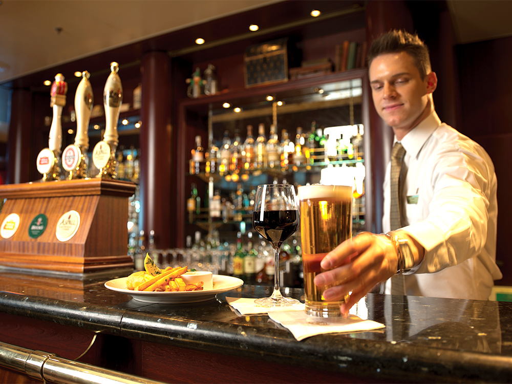 英国のパブを洋上に再現したキュナードの代表的な人気設備。エールをはじめとしたビールはもちろん、昼はパブランチも楽しめます。