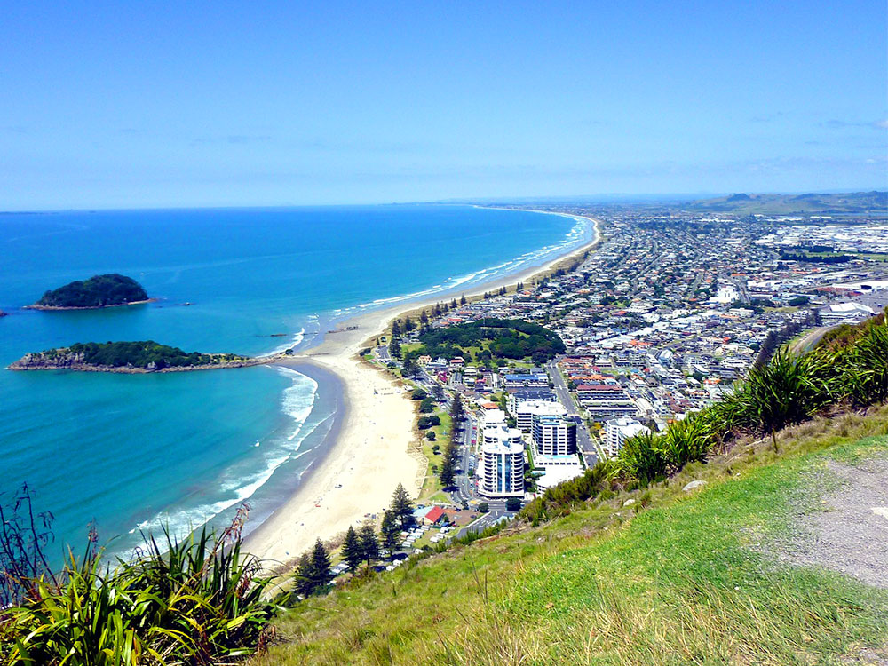タウランガは、長く続くサーフィン海岸には輝く太陽、白い砂浜、透明な海、グルメとショッピングが盛りだくさんのリゾートエリア。大きなマリーナにはたくさんのヨットやクルーザーが停泊している。港の反対側には火口丘のあるマウント・マウンガイの町があr。
