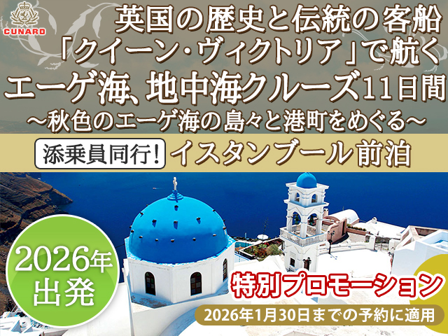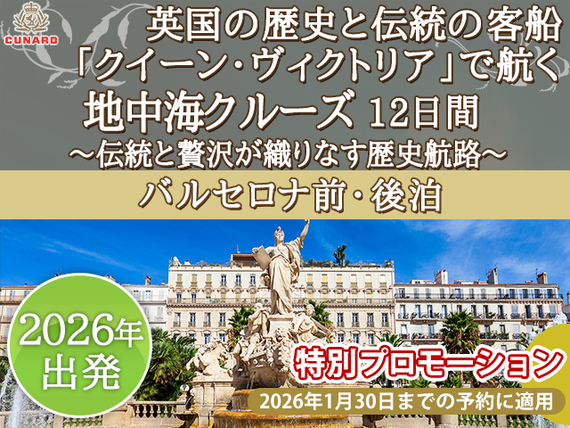 《特別プロモーションクルーズ第2弾》クイーン・エリザベスの姉妹船「クイーン・ヴィクトリア」で航く