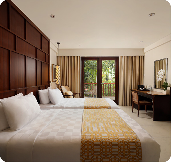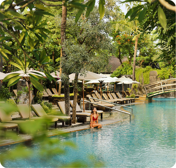 ツアーはこちらバリ島一の繁華街レギャン地区にありがなら、緑豊かで広い敷地を有するリゾートホテル。ホテル前のビーチからは美しい夕日を眺めることができます。特にアクティブな旅行者にピッタリのホテルです。