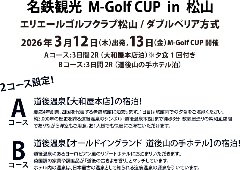 《含まれるもの》送迎代(混載タクシー/松山空港→道後ゴルフ倶楽部→ホテル送迎)ゴルフ1Rプレー代(グリーンフィ、諸経費、カートフィ、ロッカーフィ、ゴルフ利用税)