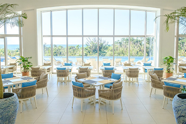 メインプールを臨む、宮古ブルーをイメージした青と白のスタイリッシュなレストラン「Beach House Restaurant」