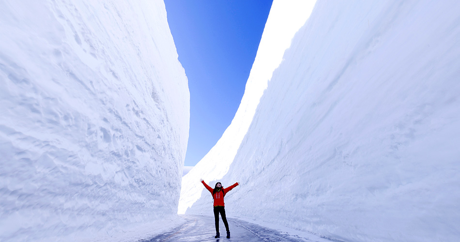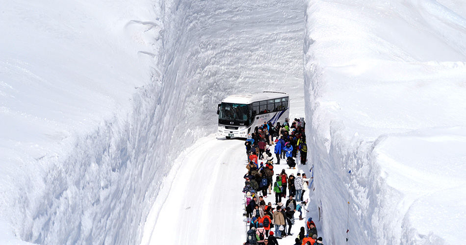 The Tateyama Kurobe Alpine Route is a sightseeing route in Chubu Sangaku National Park, connecting Toyama City, Toyama Prefecture and Omachi in Nagano Prefecture. The route affords breathtaking vistas across the North Alps, you can make the ascent by cable car, trolley bus and ropeway. The best scenery in spring is the towering walls of snow from April to May. At 2,450 meters, Murodo-daira receives an average of over 20 meters of snow each winter, one of the heaviest snowfalls in the world.